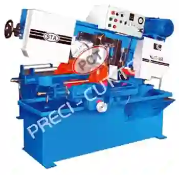 A band saw machine is a power tool used for cutting various materials, including wood, metal, plastic, and more. It features a long, continuous, toothed blade that resembles a band (hence the name "band saw"). The blade moves in a continuous loop over two wheels, allowing it to cut through the material in a straight line or along curved paths.